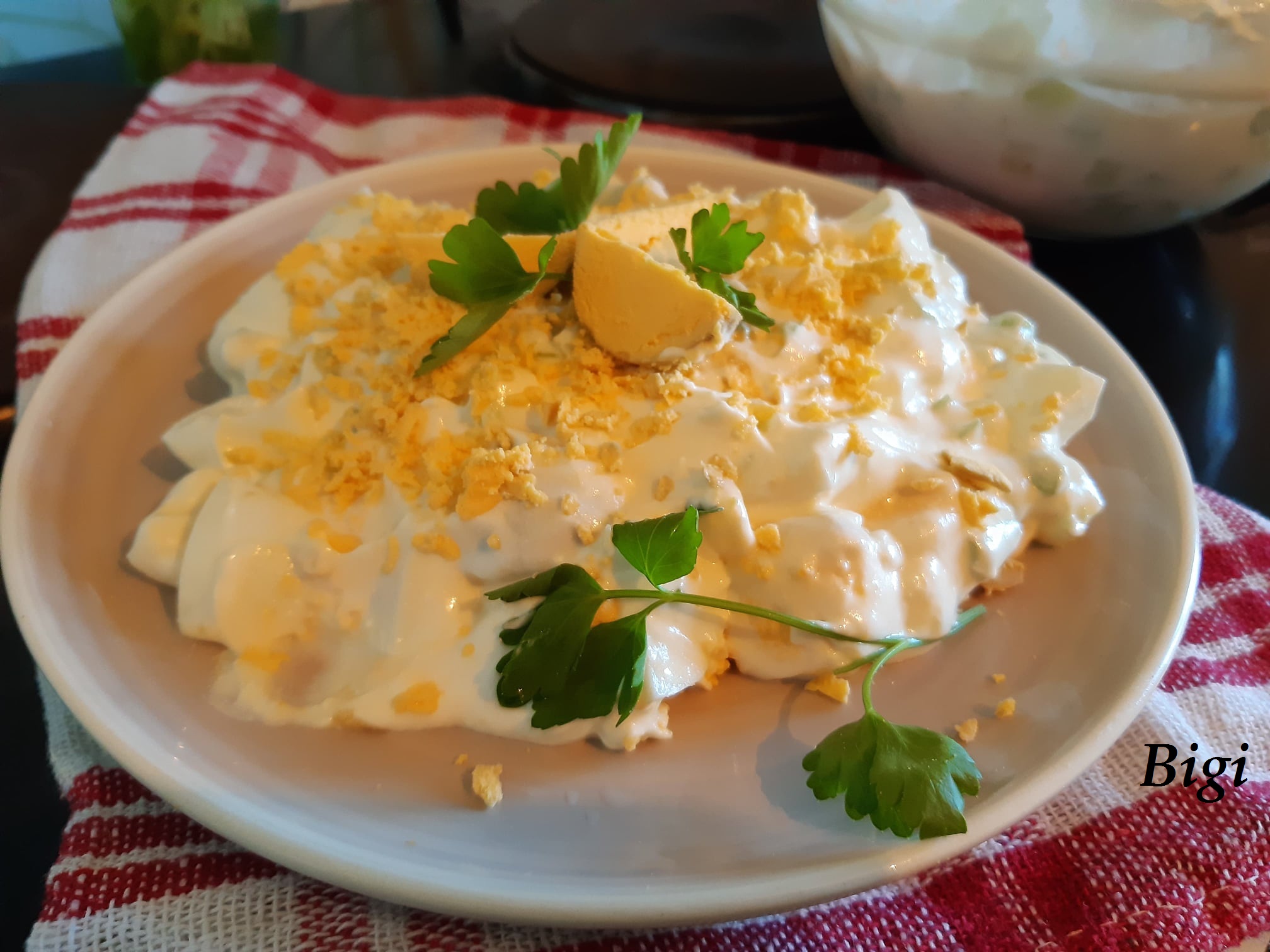 Необходими продукти: 5-6 твърдо сварени яйца, 1 брой краставица / прясна/, 2-3 скилидки чесън, 200 грама крема сирене / може и обикновено краве сирене/, 2-3 супени лъжици майонеза, 200 грама кисело мляко 3,6% или заквасена сметана, 1 супена лъжица олио /по желание/, свеж копър, сол.